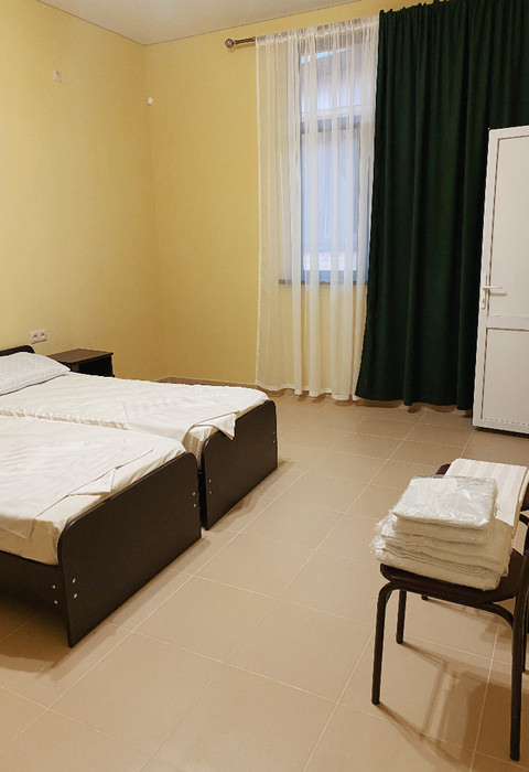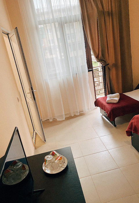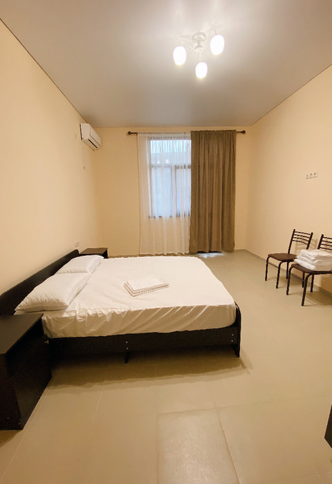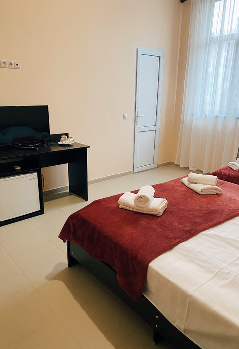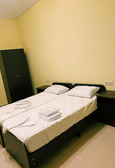 Площадь номера - 20 кв.м. 1 комната. 2 осн. места. номера находятся на 2-3 этажах, вид на соседнее здание. На этаже: кулер с горячей и холодной водой и гладильные принадлежности. В номере: телевизор; балкон; кондиционер; душ; туалет; 1-спальные/ 2-спальная кровать; мини-холодильник. 2 доп. места: